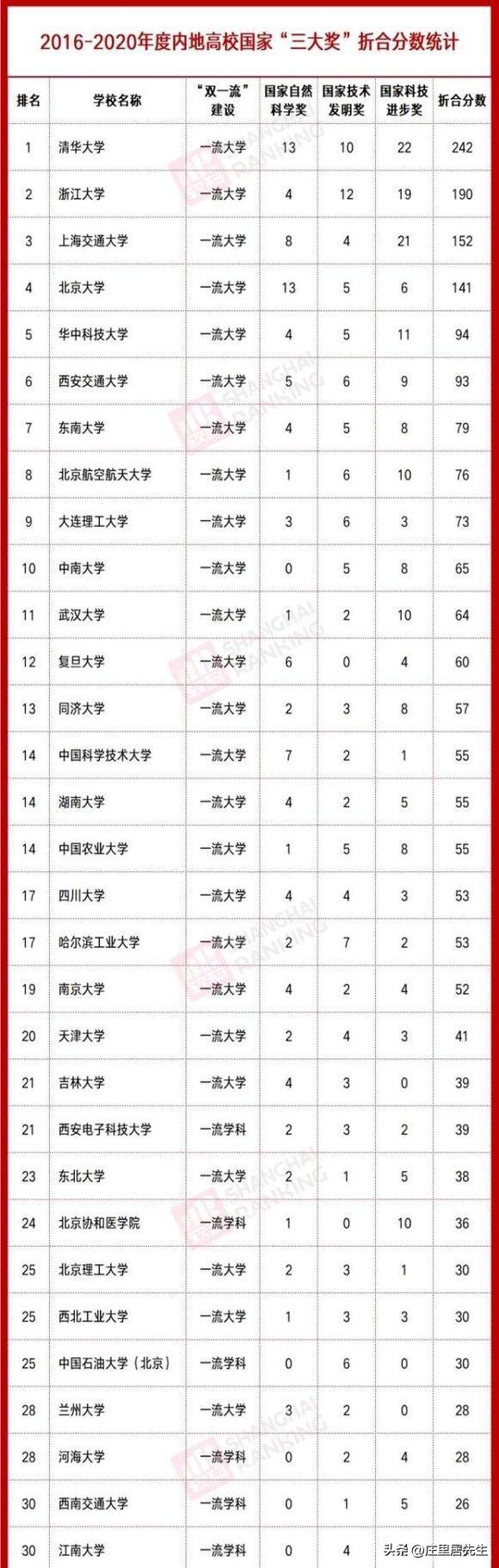 2016-2020“三大奖”统计排名,清华、浙大、上海交大、北大、华科、西安交大、东大、北航、大工和中南大学排名前十。