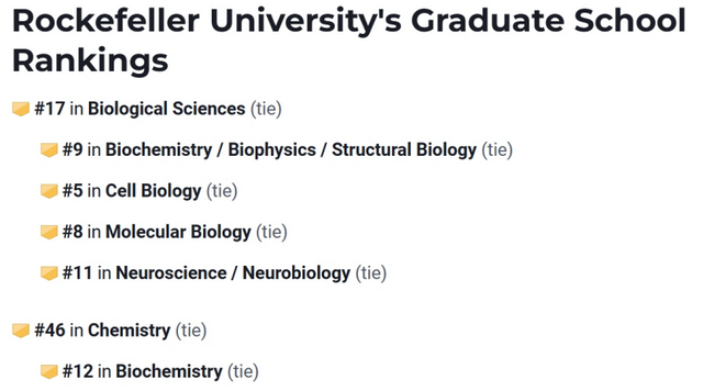 洛克菲勒大学专注于生物医学和生命科学领域,不属于综合大学,所以并未登上U.S.News、TIMES等世界大学综合排名的榜单。但其在U.S.News研究生学院的专业排名上表现非常优异:生物科学排名第17位;生物化学/生物物理学/结构生物学排名第9位;细胞生物学排名第5位;分子生物学排名第8位:神经科学/神经生物学排名第11位;化学排名第46位;生物化学排名第12位。