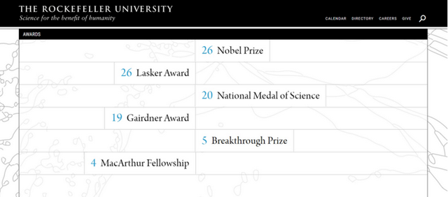 洛克菲勒大学是现代细胞生物学的起源地之一。在这里,科学家首次发现血型,DNA是一种遗传物质,以及病毒可导致癌症。20世纪许多重要的科学突破诞生于这所学校的实验室。洛克菲勒大学教师的成就在学术界几乎是无与伦比的。在大学的历史上,教师们共获得过26项诺贝尔奖和26项Albert Lasker奖,以及其他享有盛誉的荣誉。