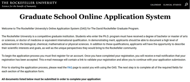 ●学历和背景要求:大学招收对科学有天然好奇心、有能力、有热情并致力于研究的学生。攻读博士学位的学生,必须已获得文科或理科学士或硕士学位,或医学博士学位或同等国际资格。申请者必须在生物、化学、数学或物理科学领域取得较高成就。