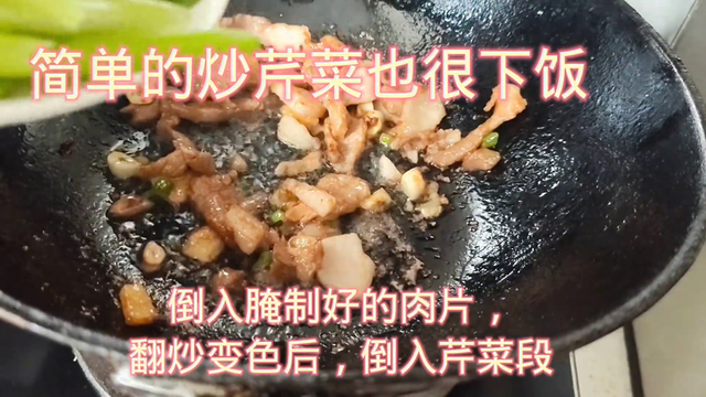 ·倒入腌制好的肉片,翻炒变色后倒入芹菜段。
