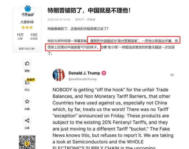 特朗普一改往前态度,修改了对华称呼,以“敌对贸易国”来称呼。
