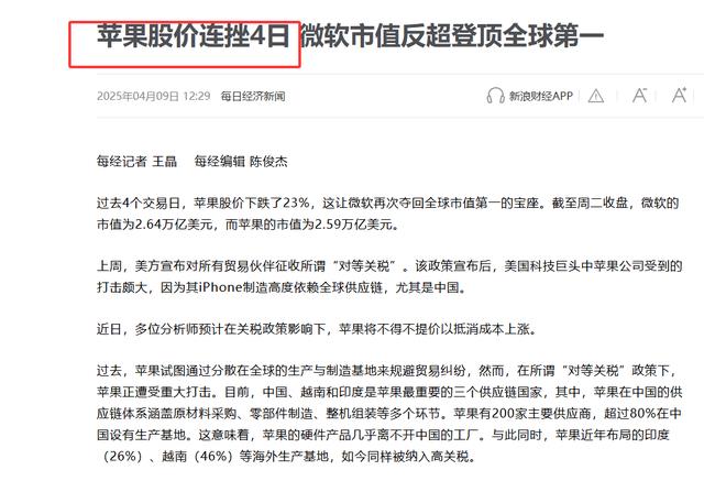 特朗普宣称对近乎所有国家征收对等关税之后,苹果股价遭受沉重打击。