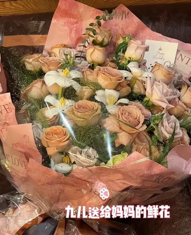 沙发上还放着女儿九儿给妈妈准备的一大束淡粉色鲜花,里面还有一份卡片,看得出来非常的用心。