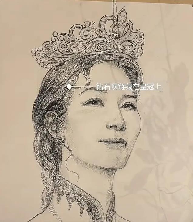 这幅画上还有份十分惊喜的礼物,这幅画上为她画了一副皇冠,而在这个皇冠上多了一颗闪闪发光的钻石项链。