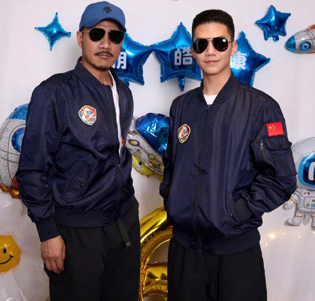随后父子俩还换了父子装,都穿上了深蓝色的棒球服,戴了一副墨镜,相当酷。
