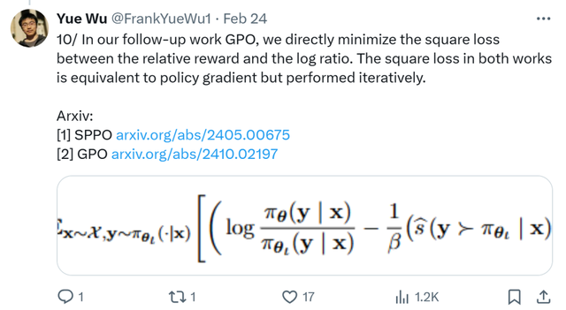 在我们后续的研究 GPO 中,我们直接最小化相对奖励与对数比率之间的平方损失。这两项工作中的平方损失等价于策略梯度,但它是以迭代的方式进行的。