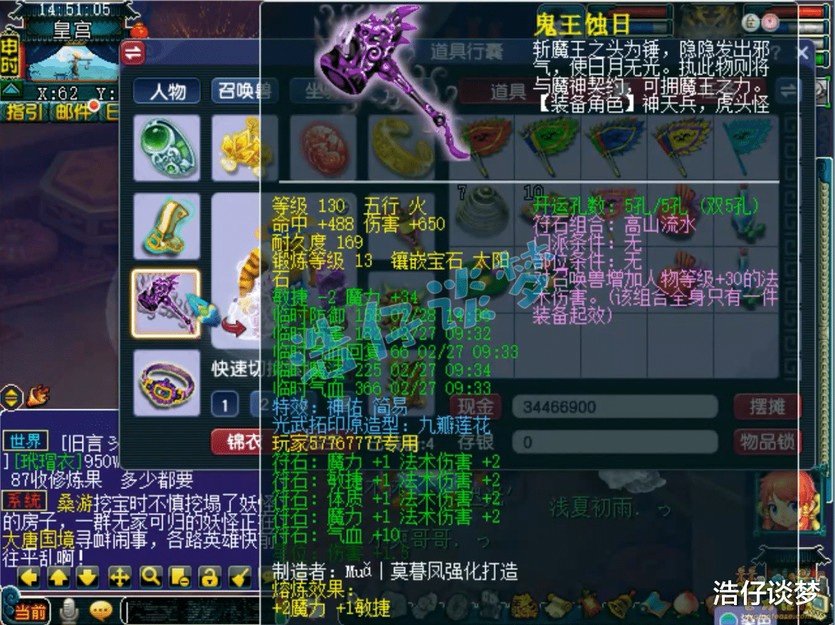 130级神佑简易高伤武器,熔炼后减1敏、加36魔,打了13锻太阳石。