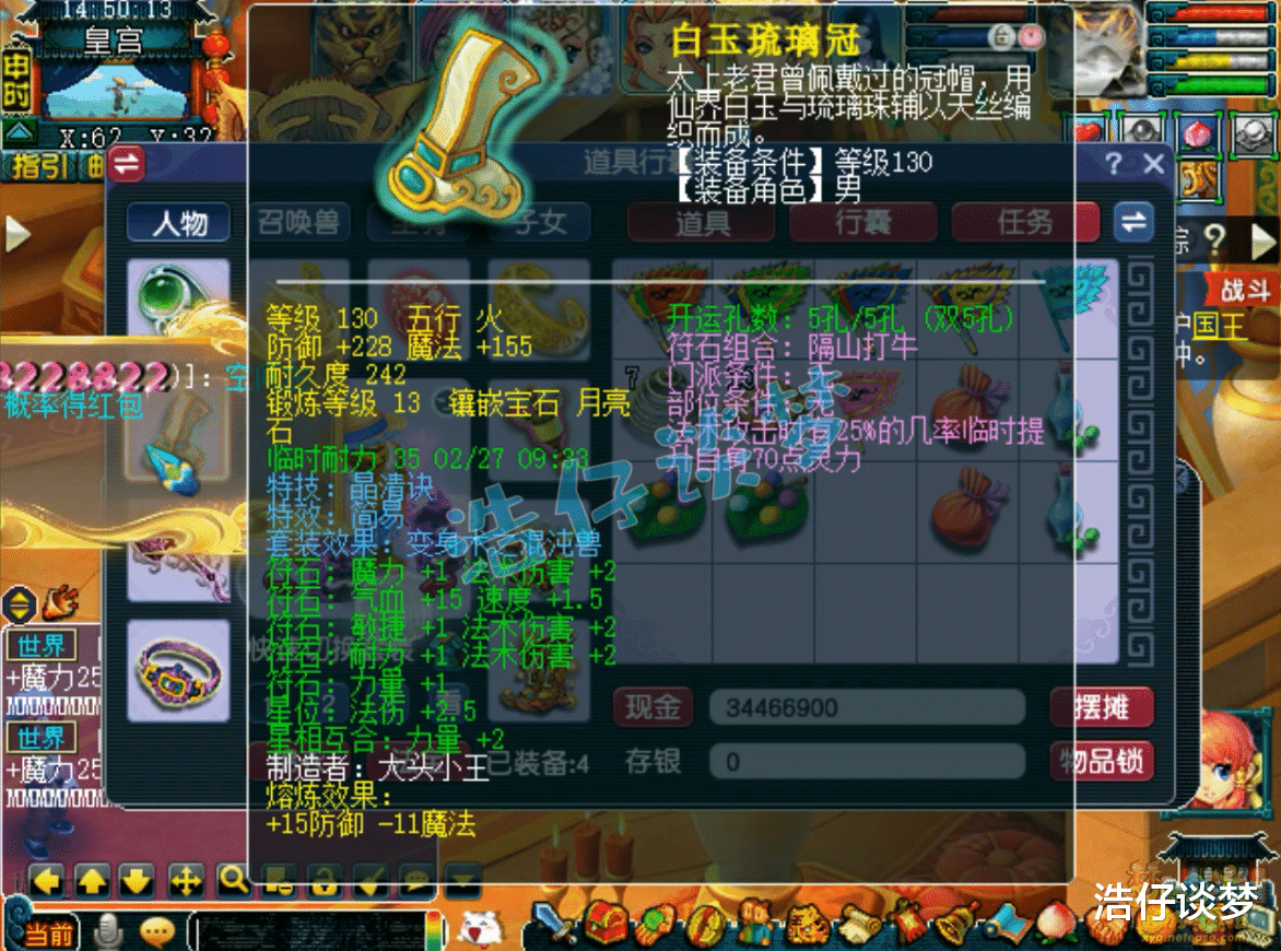 130级带晶清诀的简易混沌兽套男头,打了13锻月亮石,这应该是最顶级的130级简易装备了。