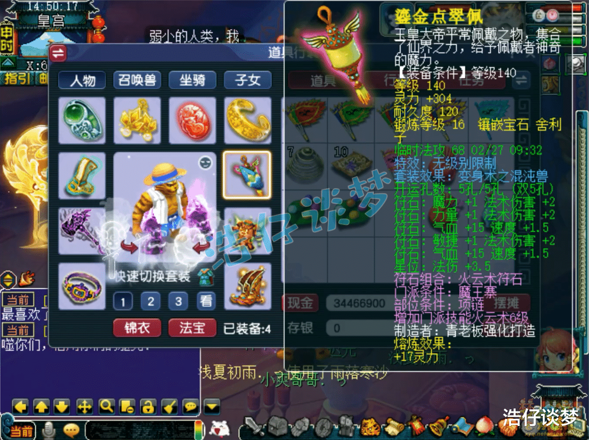 好了,这个129级魔王寨展示完毕,高端简易装备配高灵无级别项链,说他是129级简易的天花板,一点都不为过。他的宝宝搭配也非常细节,各种类型的宝宝都有。无论是杀高难度任务还是打PK,一套装备可以通用了,美滋滋!