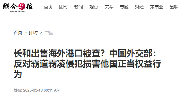 原文登载于联合早报 2025年03月19日 关于“长和出售海外港口被查?中国外交部:反对霸道霸凌侵犯损害他国正当权益行为”的报道