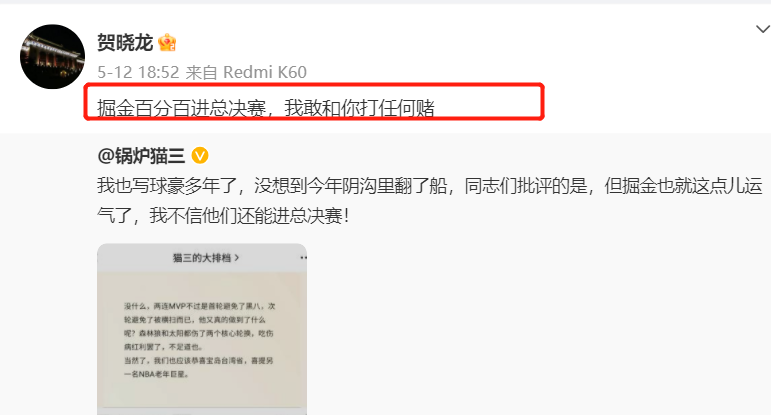 值得一提的是,在此之前,贺晓龙还在社媒上表态,他可以赌掘金队100%进入总决赛,湖人进西部决赛就是送人头,这番话也引起球迷热议,毕竟,湖人队在季后赛中展现了强大的实力,詹姆斯和浓眉的组合看起来无解,他们依旧是全联盟最出色的二人组。