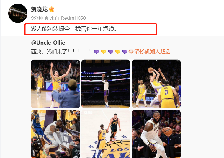 湖人队几乎创造了奇迹,在常规赛前12场,湖人队取得2胜10负的战绩,排在西部第13位,进入季后赛的概率只有0.3%。如今,湖人不仅打进季后赛,还淘汰灰熊和勇士,一路杀进了西部决赛,连续两个系列赛实现以下克上,可以说是22-23赛季最大的黑马。不过,国内记者贺晓龙不相信湖人能一黑到底,他甚至喊话球迷,如果湖人队能赢掘金的话,他管一年的泡馍。如果算起来的话,一年的泡馍价格也要上万元了,贺晓龙确实不相信湖人能一黑到底。