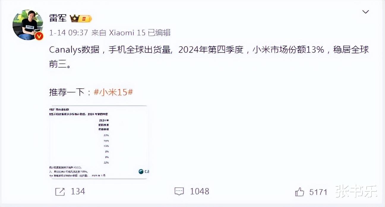 不久前,同样是Canalys的数据,雷军与卢伟冰(小米集团总裁)都在微博转发了2024年第四季度全球智能手机出货量数据图,小米的市场份额是13%,位居全球第三位。