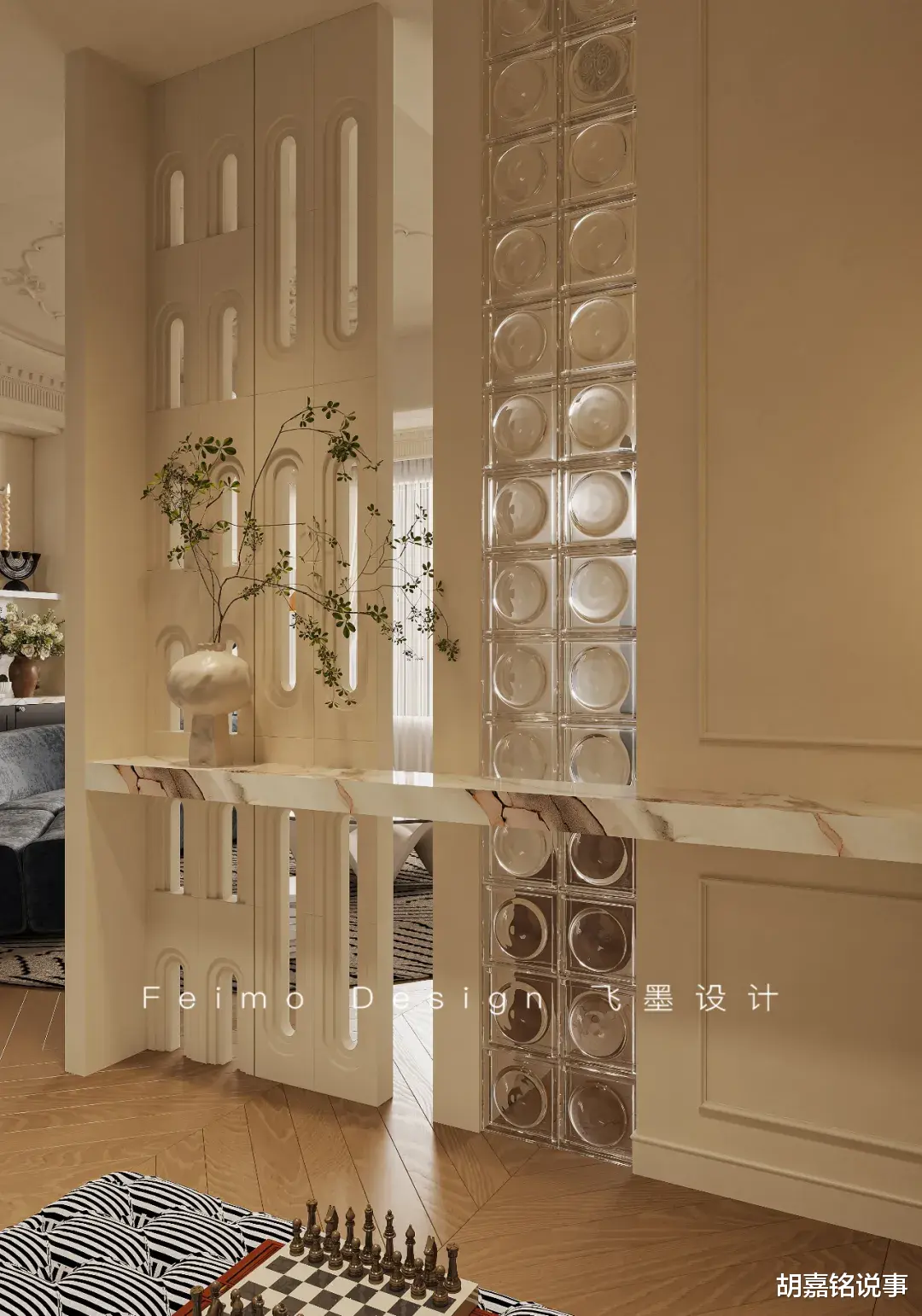 自然光在砖体折射出的粼粼波光,勾勒出玄关的高级美学。透景镂空的墙体宛如流动的艺术屏风,墙后若隐若现的绿植和客厅在保护隐私的同时延伸视觉纵深,让归家的仪式感拉到最满。
