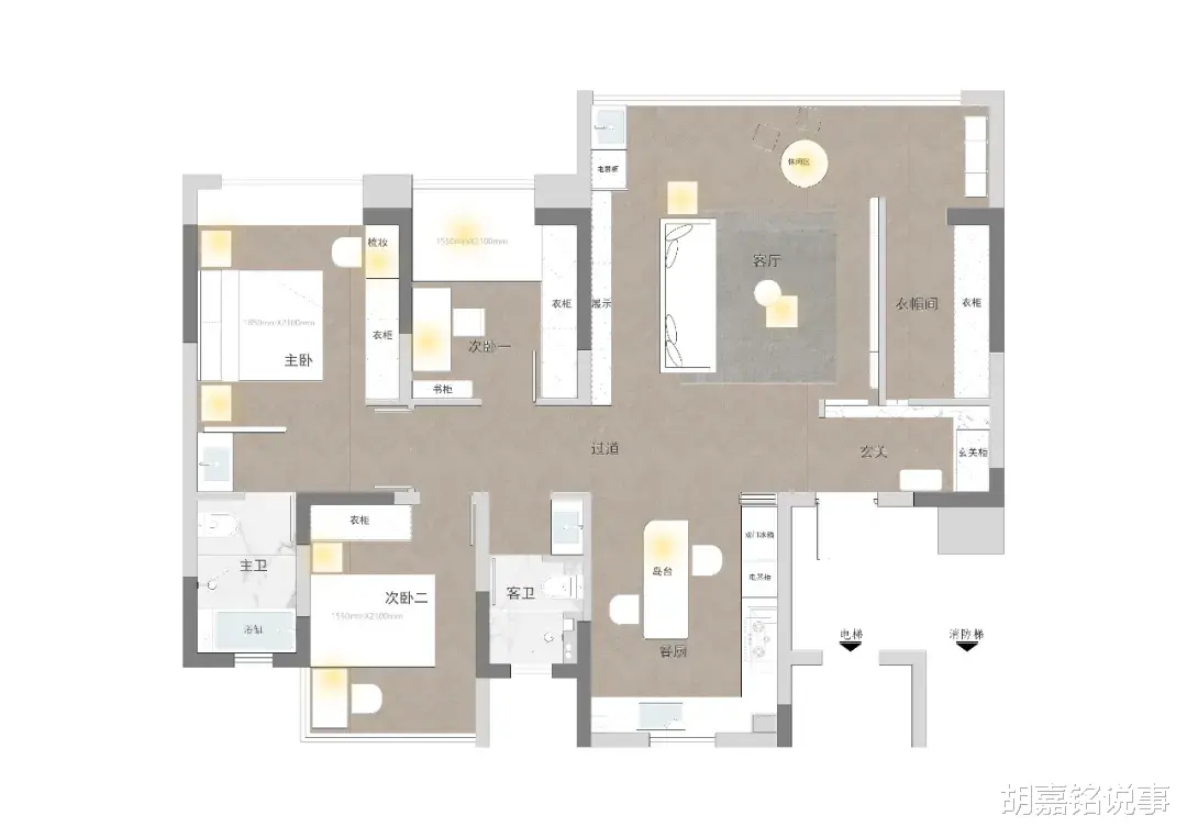 在这次的案例中,我们不按照传统格局,而是大胆创新,比如将客厅用电视墙分隔,背后作为衣帽间,保证客厅功能的同时丰富收纳。