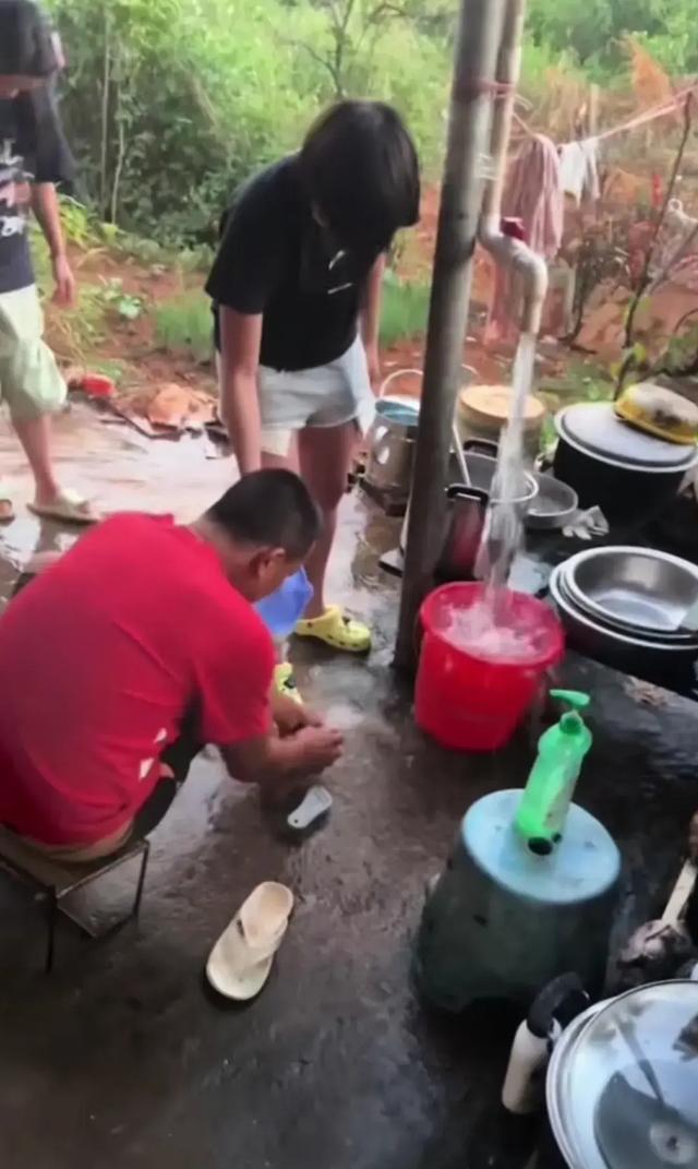她拿起水瓢,轻轻地舀起水,温柔地为爸爸冲洗脚。
