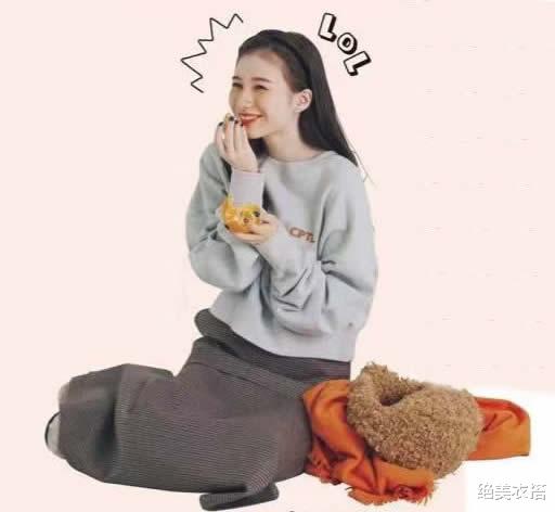 比如,这件灰色短卫衣,浅LOGO点缀,温和,雅致,搭配棕褐半裙,再合适不过。