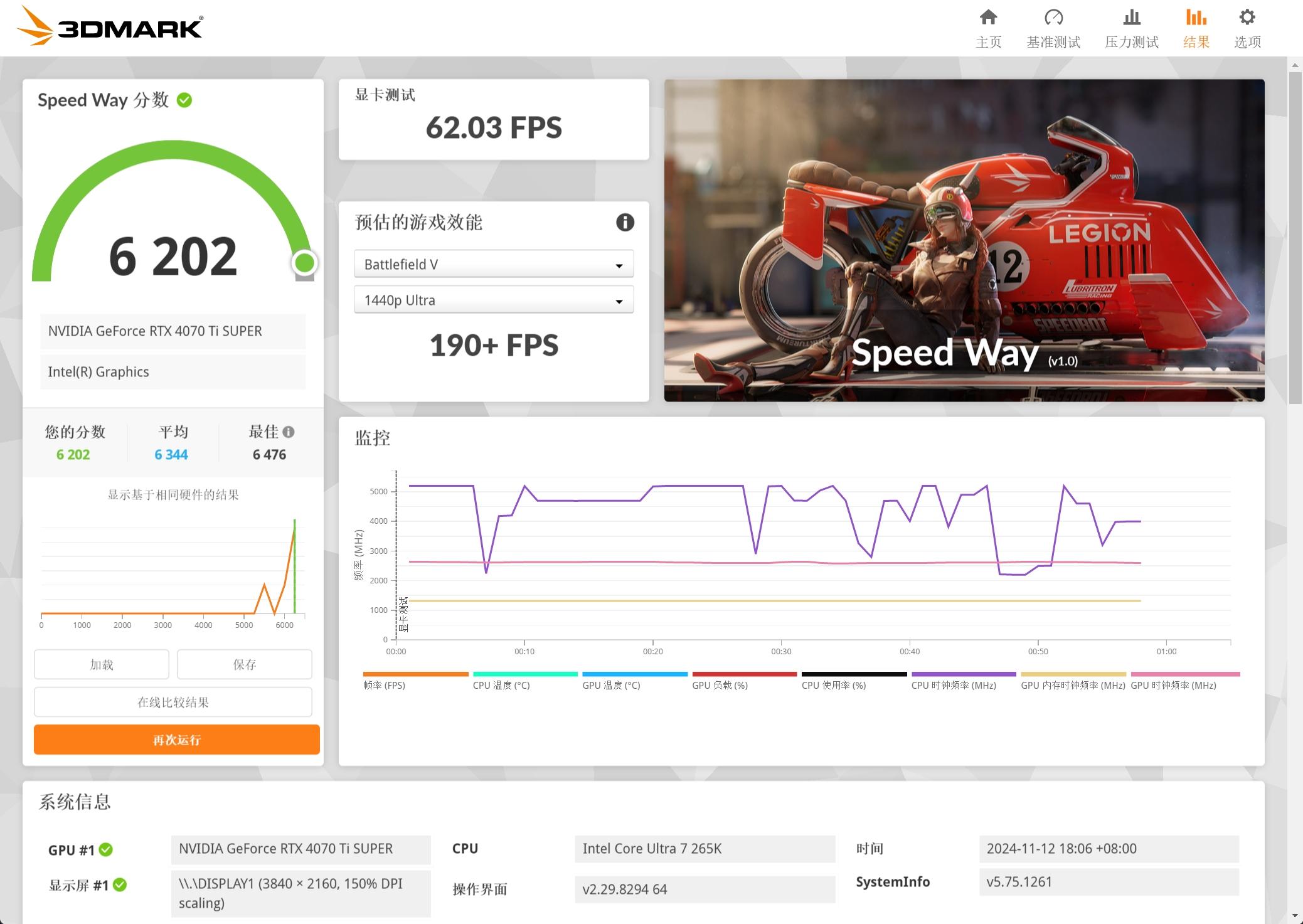 Speed Way(版本号1.0)是一项用于测试DirectX 12 Ultimate性能的显卡基准测试,该测试结合了实时光线追踪和传统渲染技术来测量显卡性能,场景含有光线追踪反射、实时全局光照、网格着色器、体积照明、粒子和后处理效果等,渲染分辨率为2560×1440。