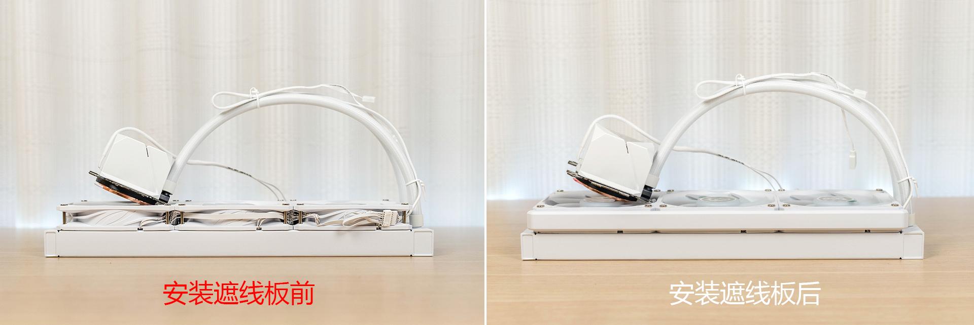 这款水冷竟然还附带了一根遮线板,安装好水冷后可以用它扣在风扇的两侧,遮挡住风扇的侧边和线材,一体化视觉效果更强烈。