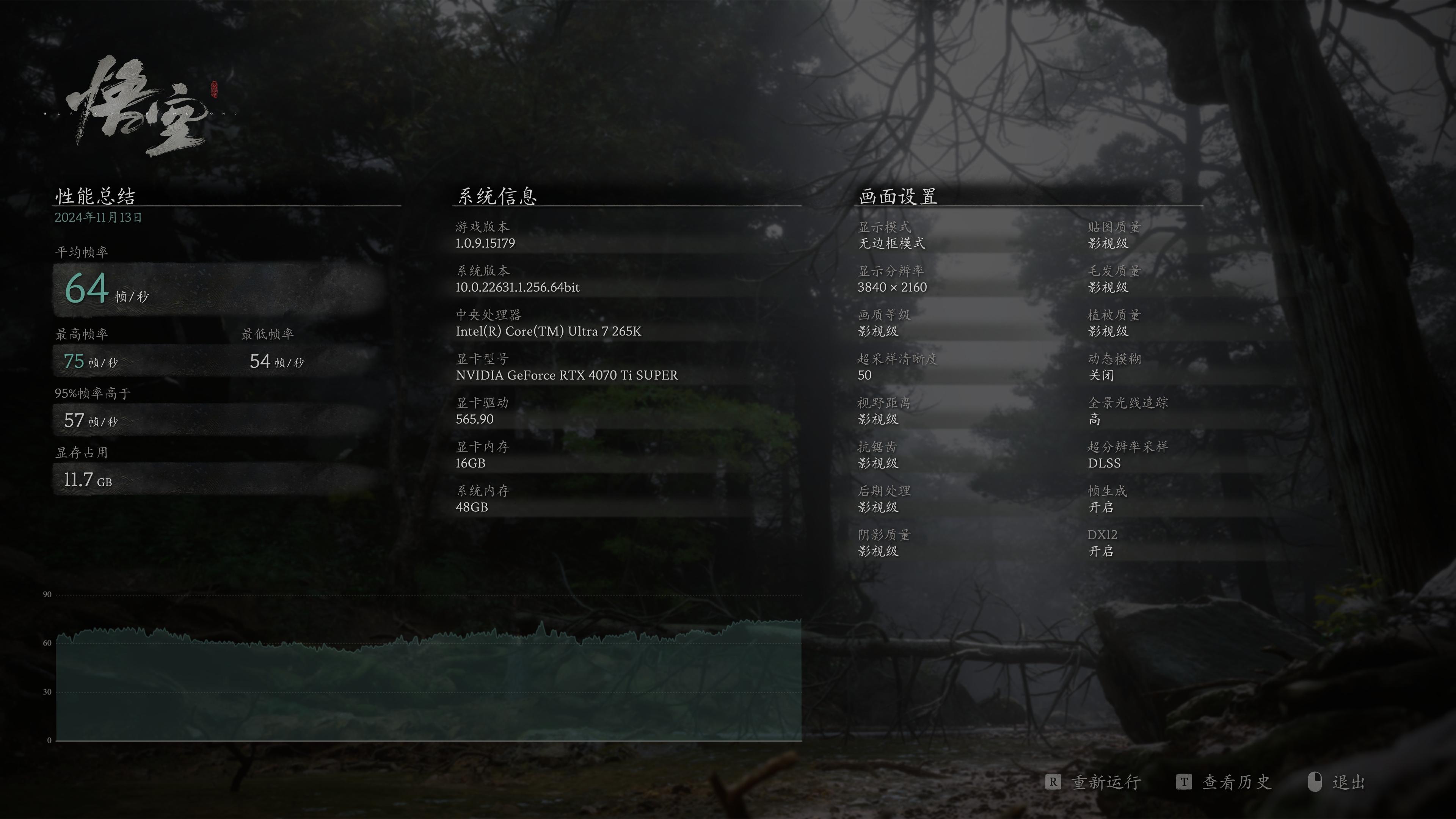 4K分辨率+影视级画质+超高全景光追+DLSS性能+帧生成,平均帧数也能达到64,基本也能流畅运行。
