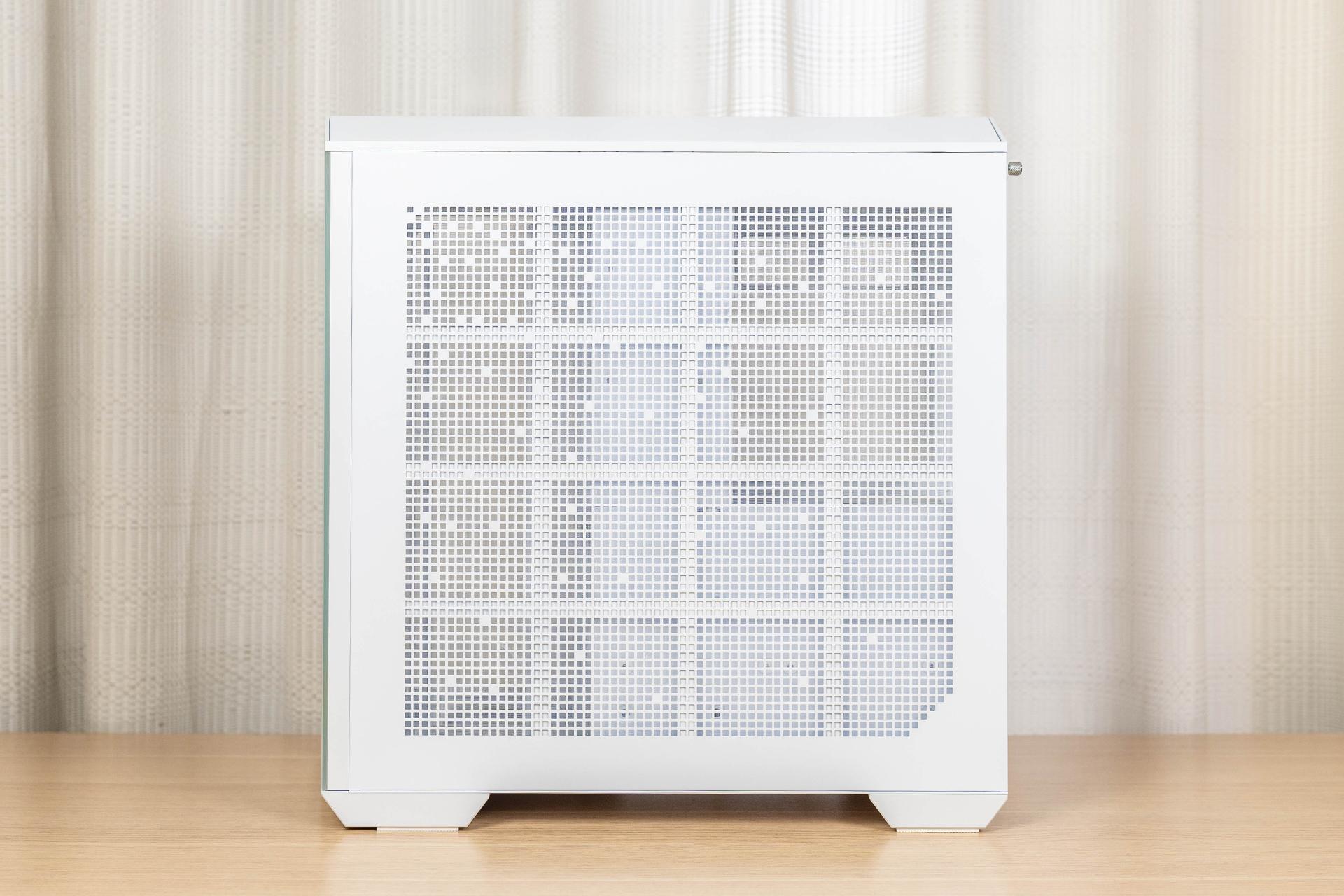 顶部、右侧、底部三面均是大面积网孔通风面板,相互形成前后贯通顺畅的散热风道,实现高效散热。同时这些通风孔都配备了可拆卸防尘网,便于清洁。
