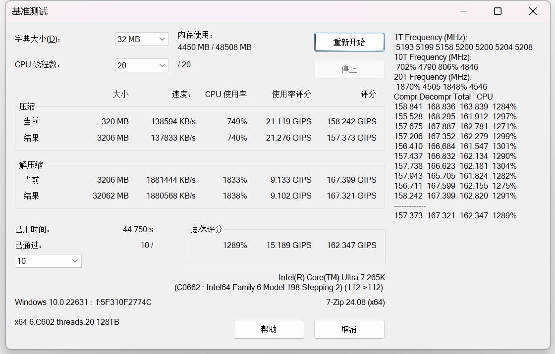 性能测试部分,大家最关心的无疑是英特尔 酷睿Ultra 7 265K这颗处理器的表现。从纸面参数看,英特尔 酷睿Ultra 7 265K是8P+12E共20个内核数,总线程数20,最大睿频频率5.5GHz,P核/E核基础频率分别是3.9GHz和3.3GHz,L2/L3缓存分别是36MB和30MB,TDP/最大睿频功耗分别是125W和250W。