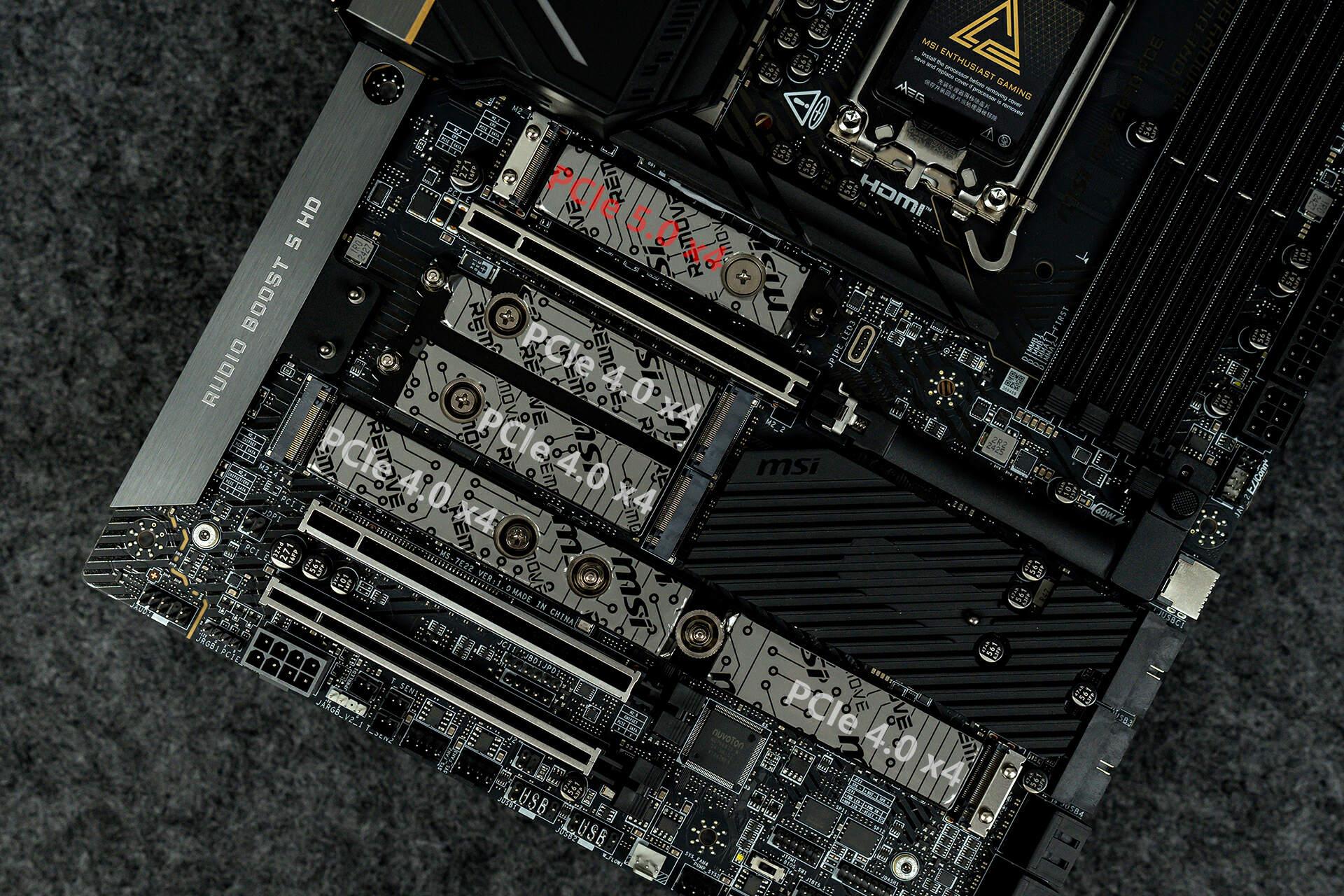 拆下两块散热装甲,我们可以看到微星 MEG Z890 ACE主板配备了5条PCIe M.2 SSD接口,最上方的接口是CPU直连的PCIe 5.0 x4通道,最大带宽128Gbps,给它单独配备了M.2冰霜马甲,保障SSD高速、稳定运行;其余4个M.2接口均为PCIe 4.0 x4通道,其中一个还支持22110尺寸的M.2 SSD。右侧是南桥散热片。