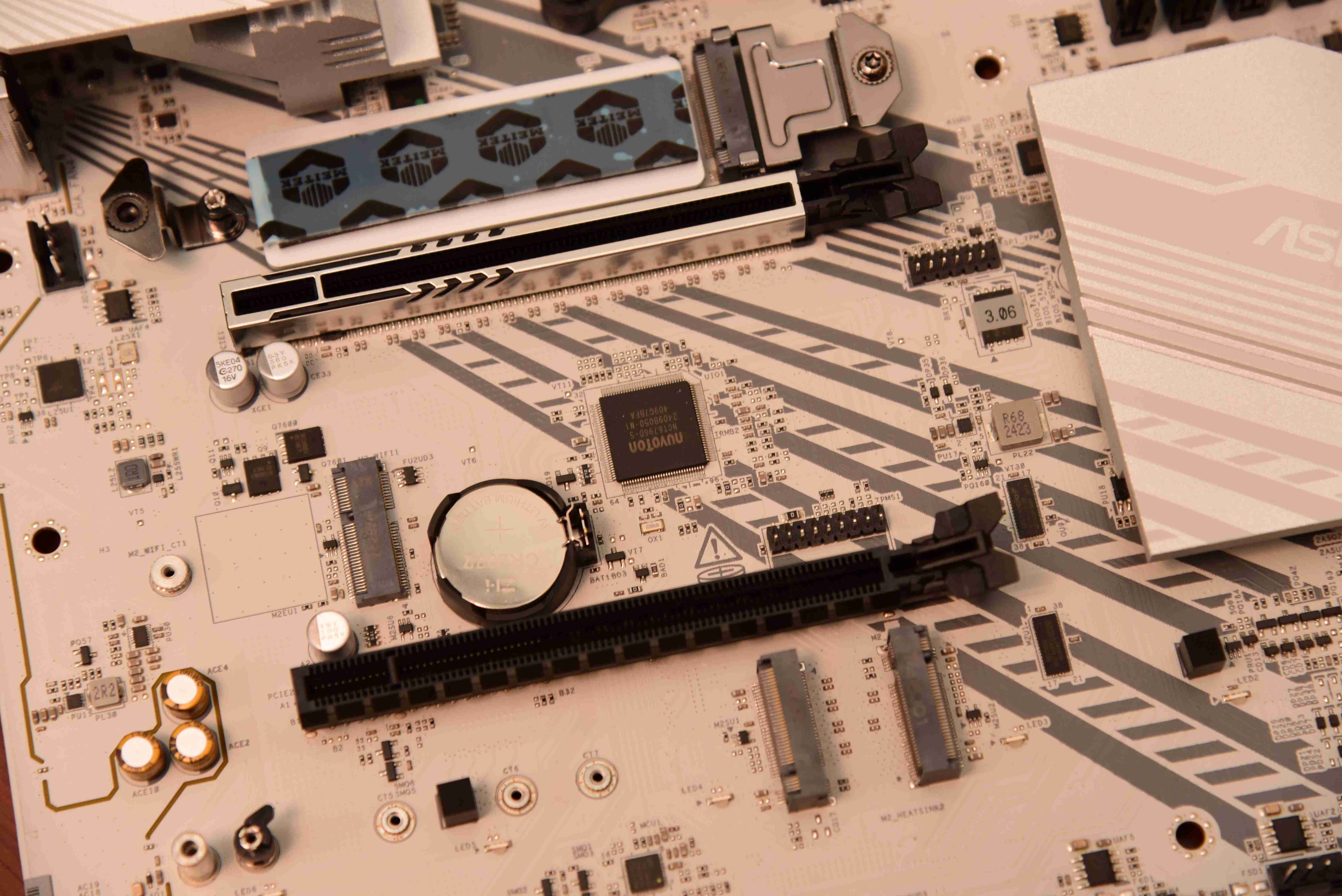 散热方面:随着ZEN5平台硬件性能的提升,必然会造成散热的增加,主板上覆盖的一体式白色散热装甲上采用了磨砂工艺,散热上还有型号的“PRO”字样,提升造型的同时,还增强了散热效果。