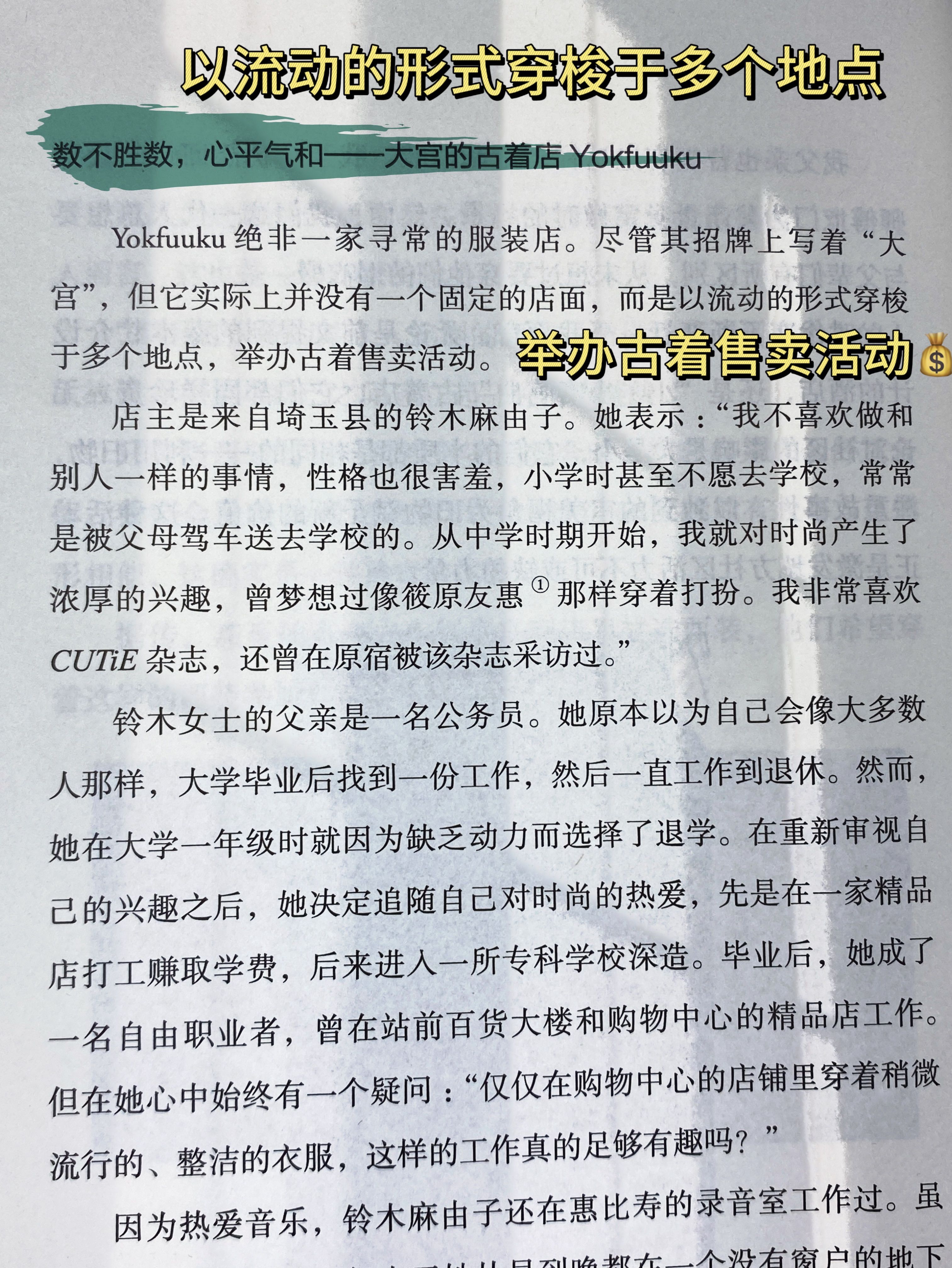 Yokfuuku绝非一家寻常的服装店。尽管其招牌上写着“大宫”,但它实际上并没有一个固定的店面,而是以流动的形式穿梭于多个地点,举办古着售卖活动。店主是来自埼玉县的铃木麻由子。她表示:“我不喜欢做和别人一样的事情,性格也很害羞,小学时甚至不愿去学校,常常是被父母驾车送去学校的。从中学时期开始,我就对时尚产生了浓厚的兴趣,曾梦想过像筱原友惠那样穿着打扮。我非常喜欢CUTE杂志,还曾在原宿被该杂志采访过。”