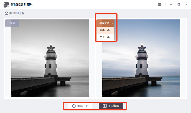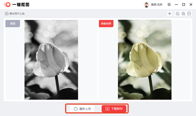 界面简洁清爽,打开就能一眼看到所需的【黑白照片上色】。选择单张图片导入后会自动处理并同时展示原图与修复效果图,满意的话就能进行下载保存了。