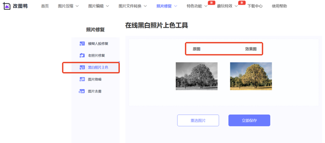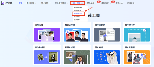 使用『改图鸭』为黑白照片上色一个多功能的在线图片处理平台,共划分为图片压缩、图片文件转换、趣玩特效等六大模块。这里只需点开“照片修复”就能找到要用的【黑白照片上色】了。