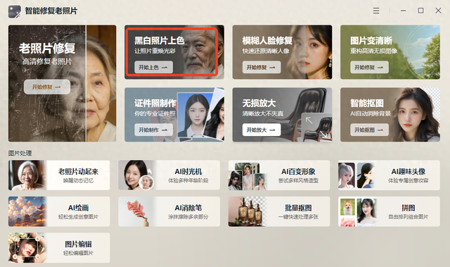 使用『智能修复老照片』为黑白照片上色这款必须榜上有名,集成了老照片修复、黑白照片上色、图片变清晰、无损放大等多种图片处理功能,界面设计直观友好,即便是初次使用者也能快速上手。