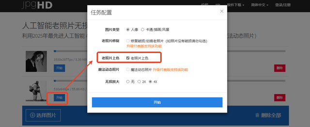 一次可选择多张图片上传,随后点击单图右侧的“开始”,接着在弹出的“任务配置”窗口直接勾选【老照片上色】再按下“开始”,耐心等待处理完成即可。