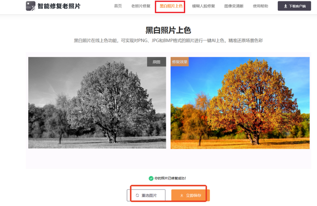同名网站也可在线为黑白照片上色,支持添加jpg、png、bmp等格式图片,会根据算法自动进行上色处理,修复成功即可预览效果图,立即保存就能导出使用了。