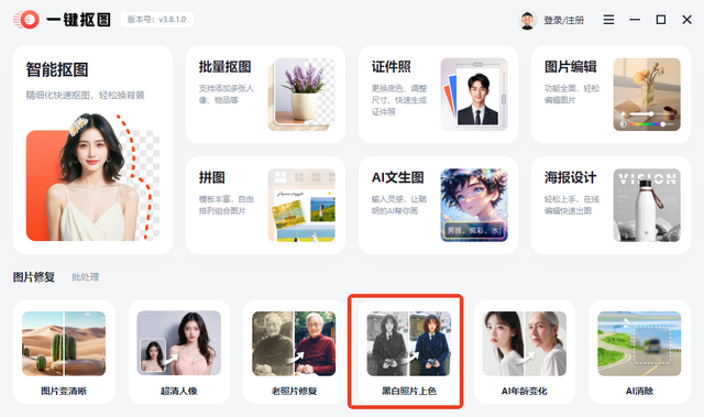 使用『一键抠图』为黑白照片上色一款为自动抠图而生的软件,凭借强大的AI识别技术能轻松实现发丝级抠图效果,同时内置拼图、证件照。海报设计等功能,满足多样化的图片处理需求。