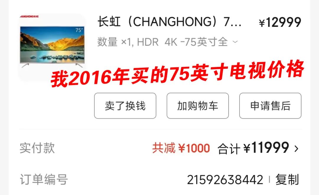 我家就是用75英寸电视,刚看了一眼订单,2016年8月找遍各种优惠方式花了10999元(还送了个三星空气净化器被我卖了1K回血)。如今75英寸居然跌到了一千多块,真是早买早享受,晚买腿打折。75英寸对于大多数家庭是最均衡的尺寸,还不用担心像85/98英寸那样上不了电梯。