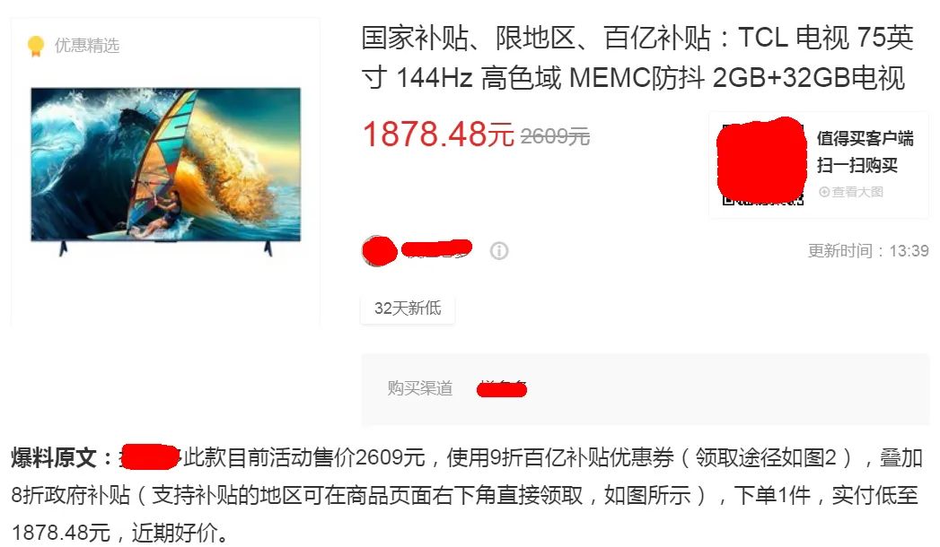 根据张大妈下午爆料,原价2609元的TCL 75英寸电视,在PDD双重补贴后实付1878.48元。直接刷新了75英寸电视本月内的历史最低价,但没有刷新历史记录,我知道去年双十一海尔75寸电视最低1650元。