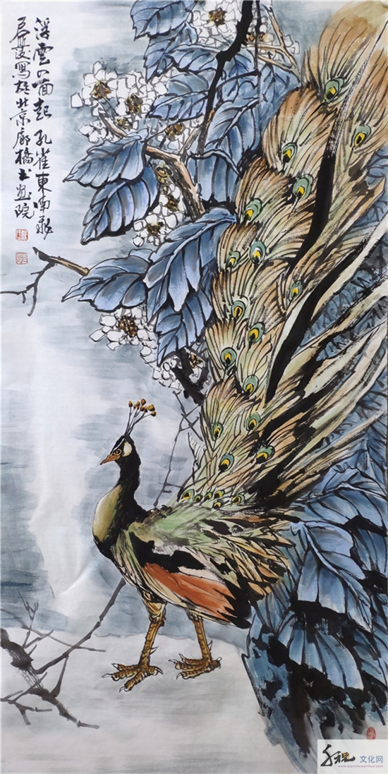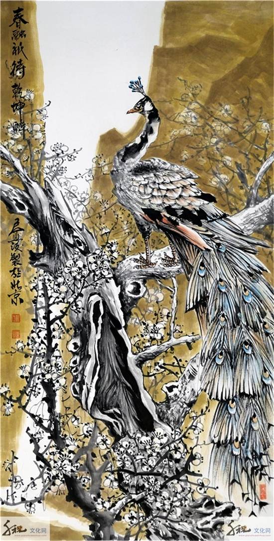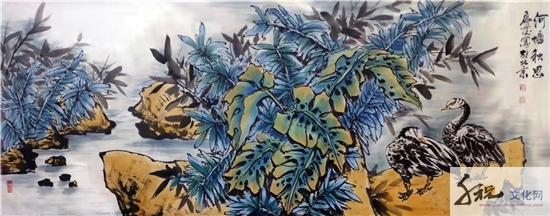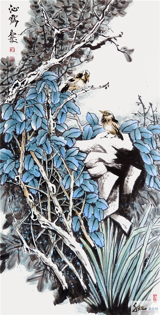 他的花鸟画,既有“富贵”、“典雅”之气,又含“野逸”、“雄强”之情。花施素墨,略染丹青,却露色飘香;鸟无啼鸣,却闻其声,跃然纸上。他的花鸟画,雄、茂、璞、厚,有雄浑大气之美。立足于生活中的审美观照,把他对于生活的热爱、对于生命的独特感知,结合自己对于传统绘画语言的领悟,内心恬淡释然的心境和宽厚的胸襟以及蓬勃生命力跃然纸上。
