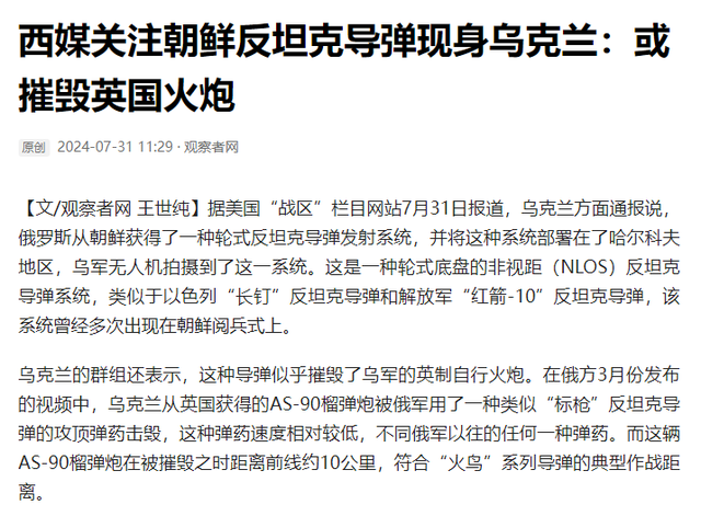 2024-07-31 11:29·观察者网 西媒关注朝鲜反坦克导弹现身乌克兰:或摧毁英国火炮