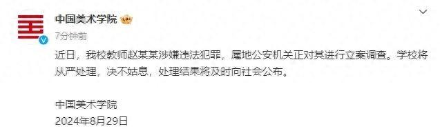 据@中国美术学院消息,近日,我校教师赵某某涉嫌违法犯罪,属地公安机关正对其进行立案调查。学校将从严处理,决不姑息,处理结果将及时向社会公布。