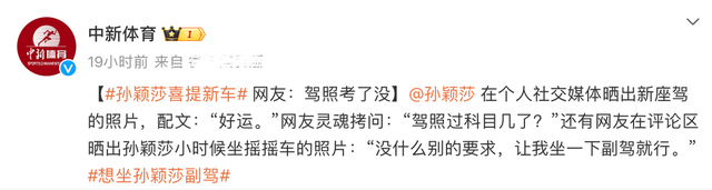 值得一提的是,网友直接发出灵魂拷问:“莎莎驾照过科目几了?”还有网友在评论区晒出孙颖莎小时候坐摇摇车的照片:“没什么别的要求,让我坐一下副驾就行。”