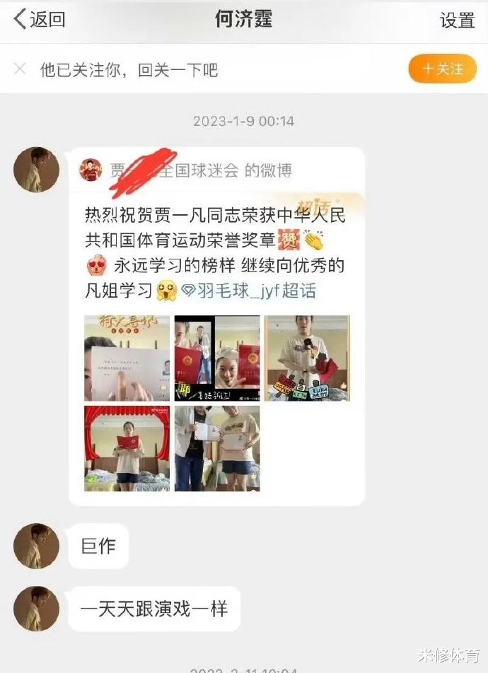4月6日,贾一凡在社交平台更新了vlog,时长15分钟。队友黄东萍将“济霆文学”活学活用,在贾一凡的评论区打趣留言“不作咯”。网友纷纷表示,国羽的女生好可爱。