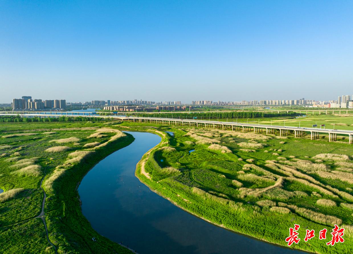 4月16日,春日暖阳,风清气爽,武汉府河湿地迎来了最美的季节。清澈的府河蜿蜒曲折,湿地上大片绿油油的草海肆意生长,随风摇摆。叶片细长交错,织成厚实绵软的绿色地毯。