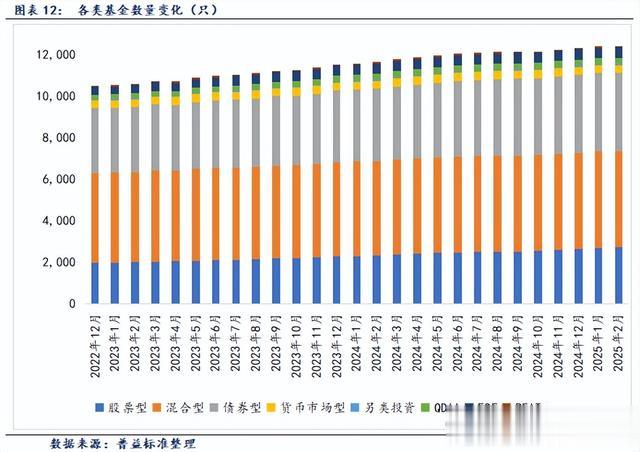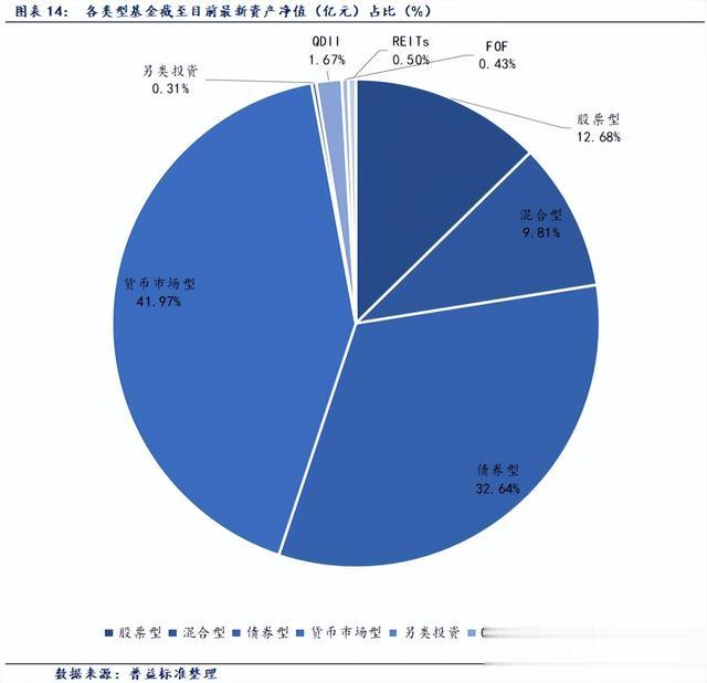 根据Wind统计数据,截至2025年2月14日,境内公募基金共有12452只,管理资产净值达324254亿元。从各类型基金来看,股票基金共有2714只,资产净值41097亿元;混合基金共有4652只,资产净值31797亿元;债券基金共3780只,资产净值105817亿元;货币基金数量为370只,资产净值136086亿元;QDII基金有307只,资产净值5423亿元;FOF基金508只,资产净值1393亿元;另类投资基金58只,资产净值994亿元;REITs基金62只,资产净值1617亿元。