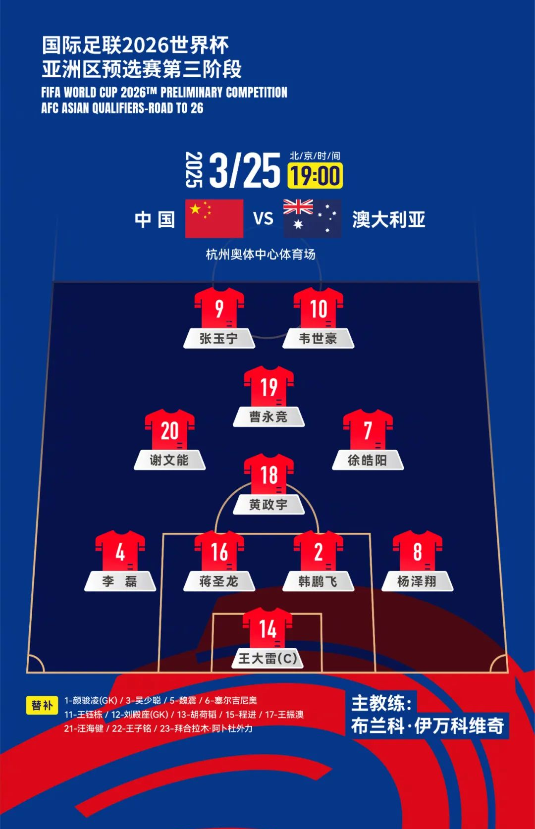 本场比赛之前,外界渲染最多的便是杭州主场的热情。创纪录的观战人数叠加主办方精心准备的一系列助威道具,让杭州的“大莲花”体育场有可能成为最火爆的主场……至于其他方面却很少涉及。其实,这也不难理解,毕竟,除了主场优势,中国男足能够指望的也确实不多——原本还想指望对手伤兵满营,缩小两者之间的实力差距,结果,对手的实力看起来并没有损失太多,反倒是中国男足自己受伤的受伤、停赛的停赛。原本还想指望伊万科维奇破釜沉舟、出奇制胜,结果,首发阵容没有任何的“惊喜”,甚至和大部分媒体人的赛前预测一模一样,依旧是442菱形站位,依旧让塞尔吉尼奥坐在板凳上。伊万曾解释过,对新赛季尚未上过场的塞尔吉尼奥有些放心不下,但他却对最近5场比赛只上过1分钟的杨泽翔信赖有加,让之前被排除在23人名单之外的黄政宇直接首发出场……