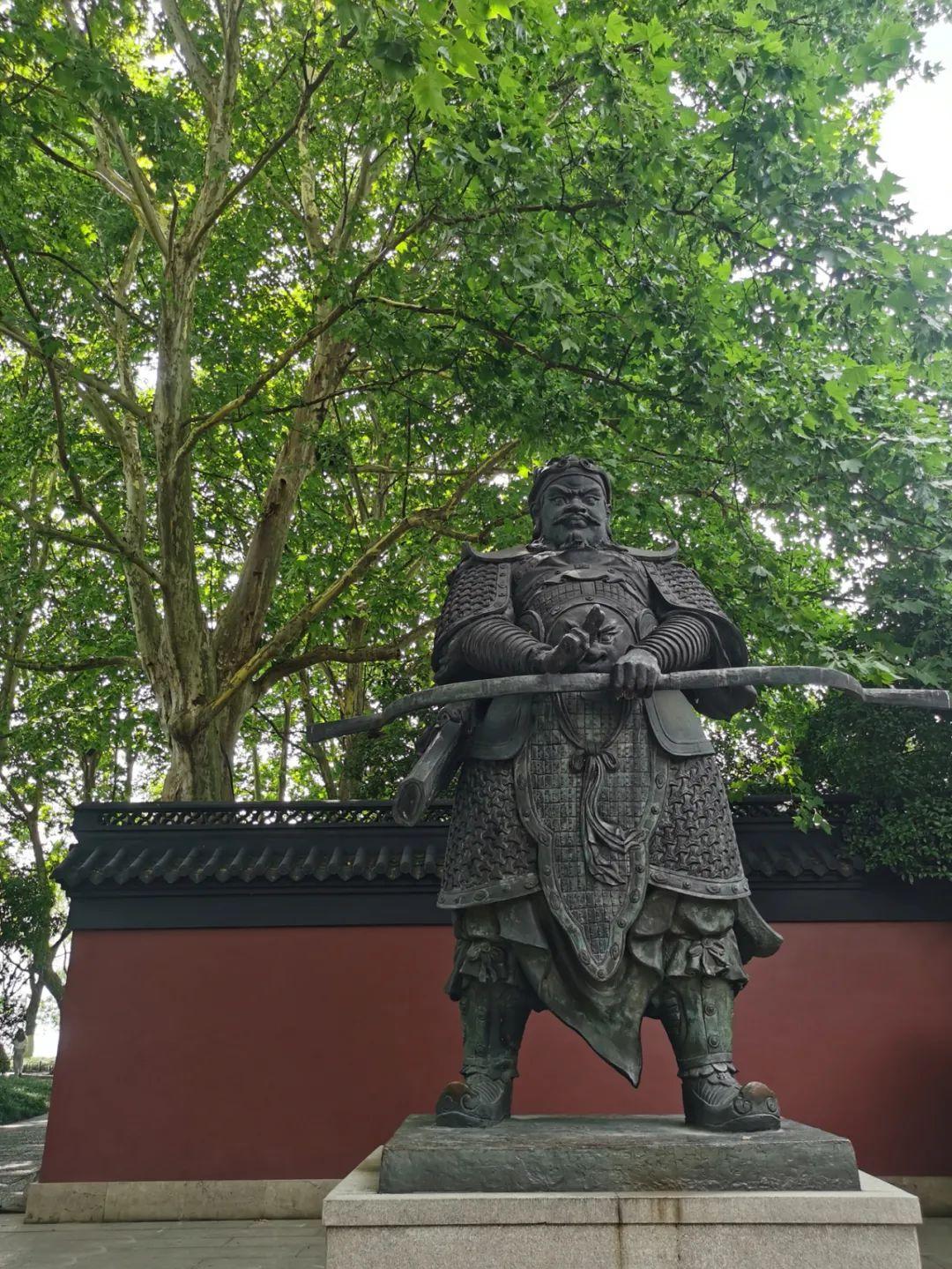 牌坊的尽头站着第一代钱王钱镠,顶盔掼甲,手持弓箭,横眉瞠目,一派武夫、战神形象