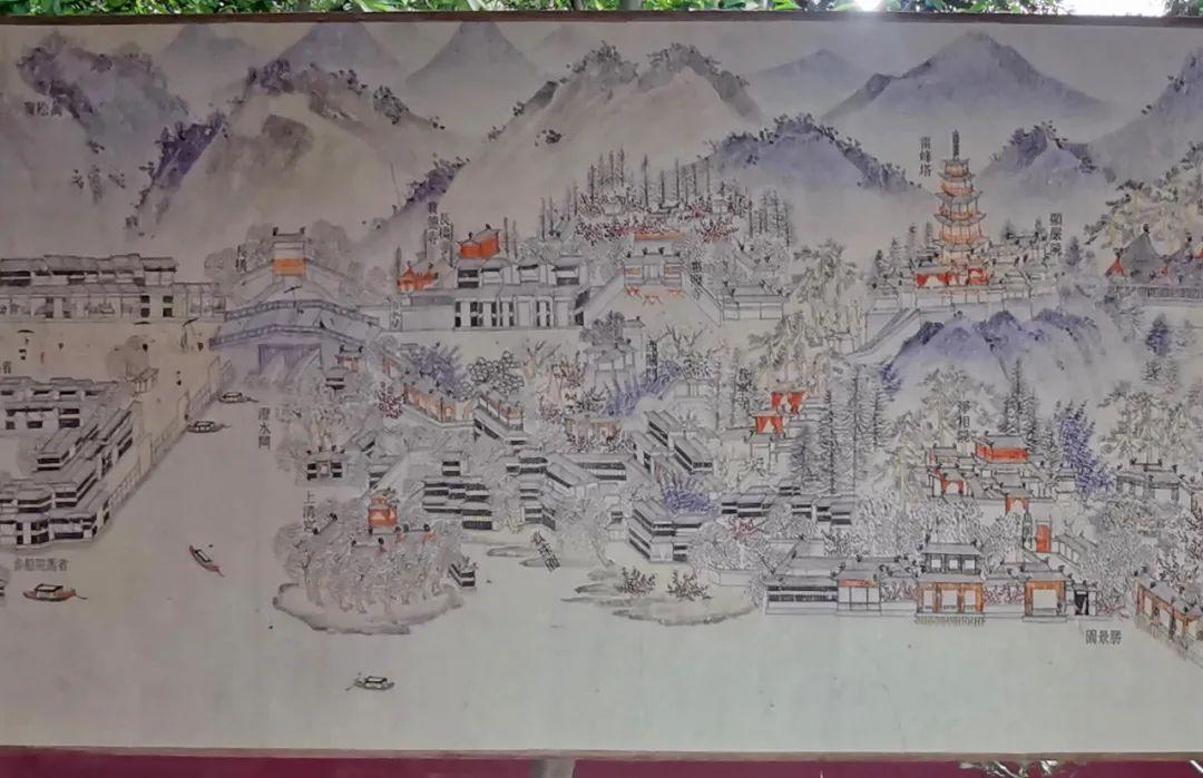 被五王殿右侧长廊上悬挂的《西湖繁胜全景图》深深吸引,找到了南宋时的雷峰塔,距离977年钱弘俶建塔只有200多年,应该还是初建时的样子吧?