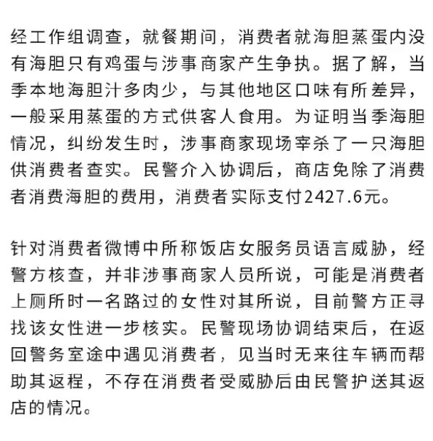 报道里提到,女服务员的语言威胁并不属实。涉事商家人员没有说这样的话,这可能是路过的一名女性对其所说。报道里还有说到,产品销售加工过程公开透明,但是李先生并不认为,因为商家经理直接报价800元/斤,最后买单价是988元/斤。