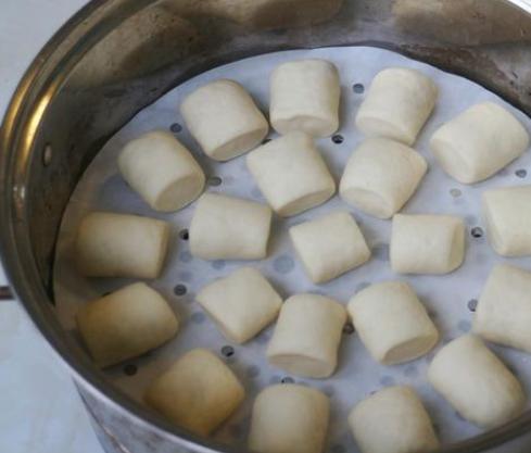 案板上撒上一层干面粉,把面团拿出来揉10分钟,这样能够排出面团里面的空气,搓成长条后切成1cm大小的小剂子,整理好后放入蒸笼,蒸笼下面最好放温水,这样能够加快剂子面团的发酵,盖上锅盖静置半小时,剂子就发酵成2倍大小了,在这里大家一定要记得,摆放的时候要隔一些距离,不然馒头很容易发酵粘连在一起。
